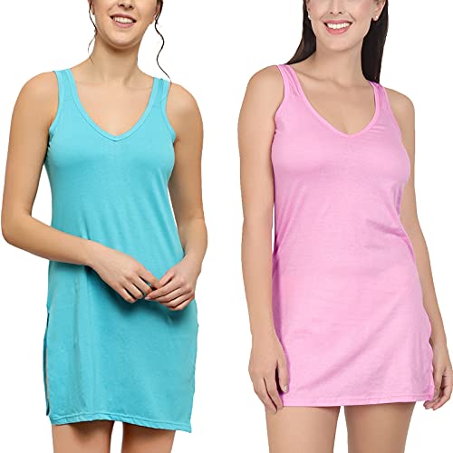 BLAZON Women's Cotton Hosiery Selfie Midi Slip Combo Pack of 2 (Available Sizes: XS, S, M, L, XL, 2XL, 3XL, 4XL, 5XL) - Turquoise, Pink