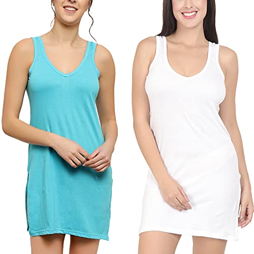 BLAZON Women's Cotton Hosiery Selfie Midi Slip Combo Pack of 2 (Available Sizes: XS, S, M, L, XL, 2XL, 3XL, 4XL, 5XL) - Turquoise, White