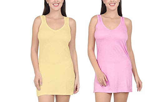 BLAZON Women's Cotton Hosiery Selfie Midi Slip Combo Pack of 2 (Colour: Skin / Dull Yellow, Pink; Size: L; Length: 33in; Bust: 36in)