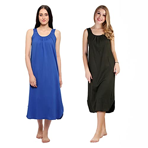 BLAZON Women's Cotton Hosiery Solid Maxi Nighty Slip (Pack of 2) Available Sizes: S, M, L, XL, 2XL, 3XL, 4XL, 5XL - Sapphire Blue, Martini Olive
